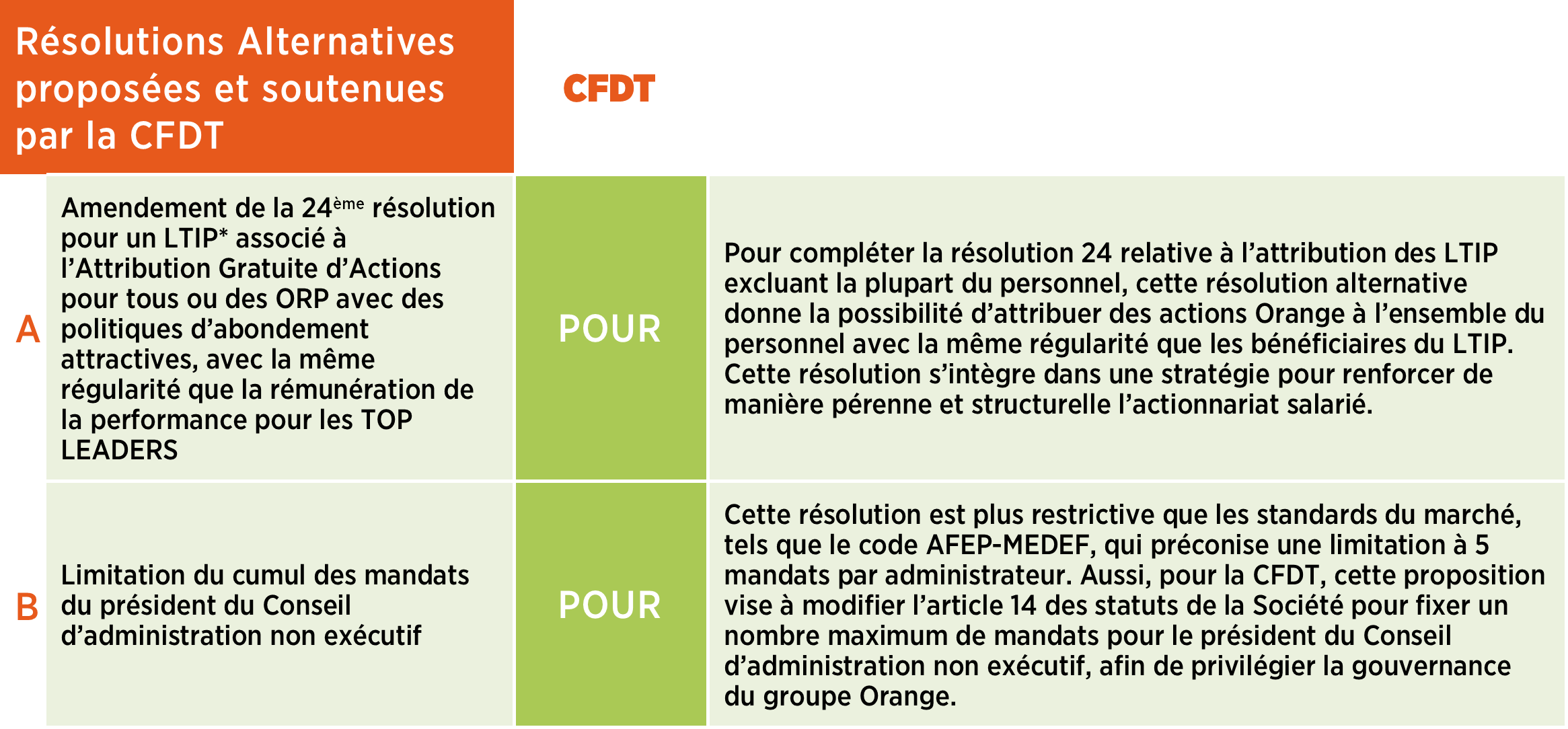 Pour vous aider, la CFDT vous fait part de sa politique de vote et de ses analyses pour peser sur la stratégie du groupe. En complément la CFDT continue d’interpeller la nouvelle gouvernance d’Orange sur ses ambitions pour renforcer l’actionnariat salarié.
