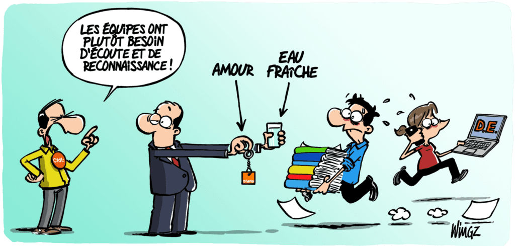■ Partout, les mêmes plaintes : le travail est dense, la relation clients exigeante, les outils multiples et les priorités changeantes. « Avant on vendait, maintenant on gère du mécontentement » (DOGSO). « On fait des prouesses chaque semaine. Sans un mot » (DOIDF). Ce n’est pas la mission qui use, c’est le manque de sens et de reconnaissance. La CFDT dénonce un pilotage à distance, saturé d’indicateurs, où les salariés se sentent invisibles. Le collectif résiste tant bien que mal…