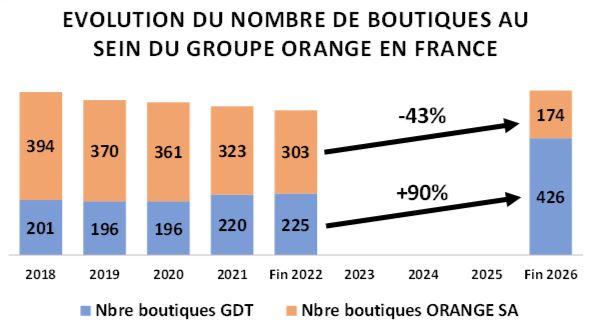 La direction d’ORANGE souhaite accroître son réseau de boutiques en France, en passant de 528 boutiques en 2022 à 600 en 2026, tout en réduisant ses coûts de fonctionnement globaux. Pour ce faire, elle va pratiquement réduire de moitié le nombre de boutiques en maison-mère (Orange SA) et quasiment doubler le nombre de boutiques gérées par la Générale de Téléphone (GDT), filiale à 100% d’Orange SA.