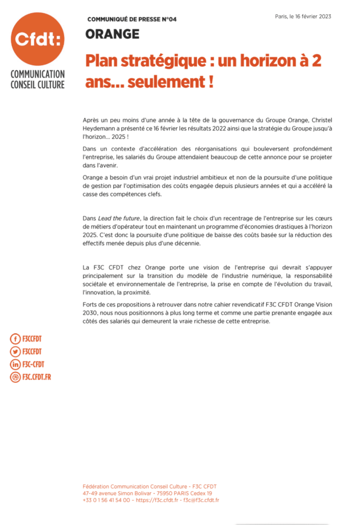 Forts de ces propositions à retrouver dans notre cahier revendicatif F3C CFDT Orange Vision 2030, nous nous positionnons à plus long terme et comme une partie prenante engagée aux côtés des salariés qui demeurent la vraie richesse de cette entreprise.